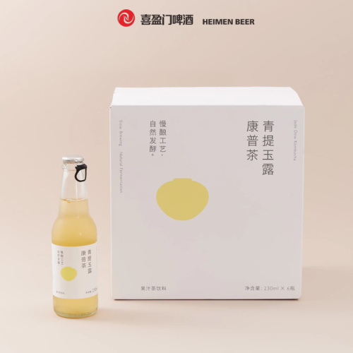 يتم تقديم المنتج في زجاجة زجاجية أنيقة وقابلة لإعادة الاستخدام مع إغلاق مريح، مصمم للحفاظ على نضارة المنتج والسماح بإعادة إغلاقه بسهولة. يكشف الزجاج الشفاف عن سائل شاحب ومضيء يعكس الطابع الفاكهي الفاتح للكومبوتشا. تؤكد العبوة البسيطة، مع الملصق البسيط وصندوق الهدايا المطابق، على الجودة الحرفية للمنتج والالتزام بالبساطة الطبيعية، مما يجعله جذابًا بصريًا وصديقًا للبيئة.